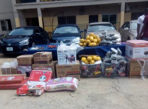 Items recovered were a total of eight (8) arms, sixteen (16) live ammunition, six (7) vehicles, , two(2) axes, nine (9) generators, seven (7) TVs, two , two (2) knives, one (1) home theater, twenty-seven (27) phones,1 bag parboiled rice harddrugs and decomposing human hands.”