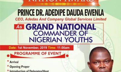Prince Dr. Adedipe Dauda Ewenla, the CEO of Adedas Global is set to be honored by the Congress Of Nigerian Youth ( CONYO) with an award...