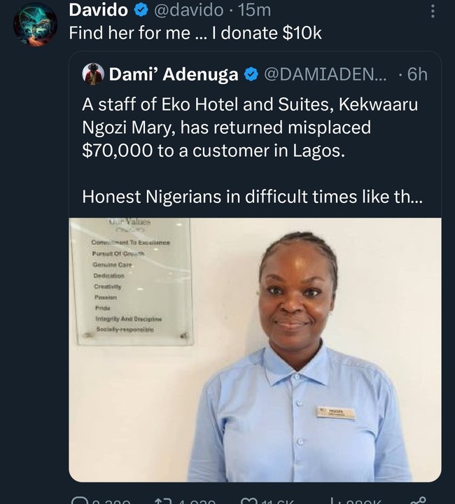 Commendably, multiple award-winning afrobeat sensation, David Adeleke, widely known as Davido, has disclosed his intention to reward a staff of Eko Hotel and Suites, Kekwaaru Ngozi Mary, with $10,000 for returning $70,000 misplaced by a customer in Lagos.