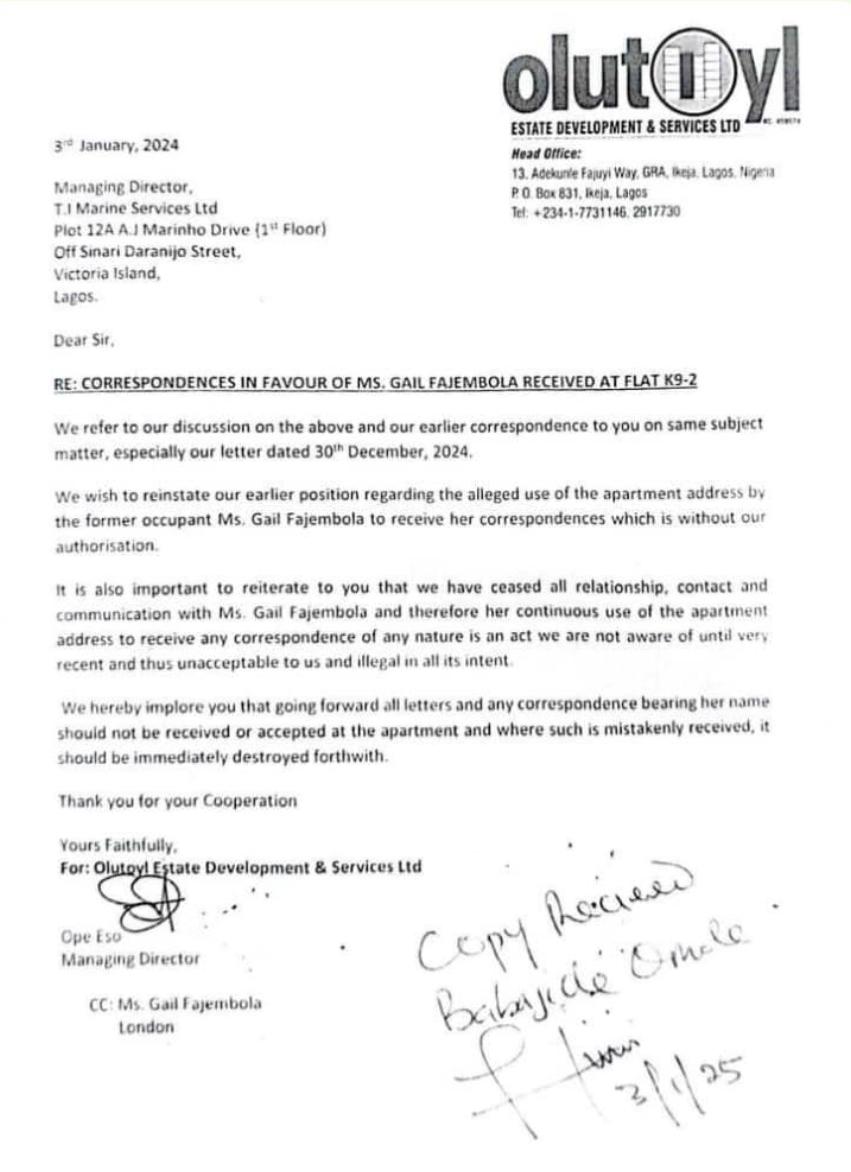 Findings reveal that to ensure a clean break from this past relationship, Tunde Ayeni’s property firm recently wrote to the occupants of one of his choice properties in Victoria Island to inform them that Gail Fajembola should no longer be allowed to use the address as her mailing address and should no longer receive her mails through the office address. The correspondence was firm in its assertion that the business mogul and his company no longer have anything to do with Gail. ( letter attached).