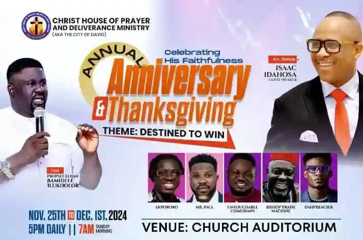 Prophet Elijah Bamidele Ilukholor, the esteemed General Overseer of Christ House Of Prayer and Deliverance Ministry , expresses deep gratitude for the journey of His Grace. This is why we are rolling out the red carpet to tell the world what God has done, celebrating God’s unfailing Love, with the theme *Destined To Win*