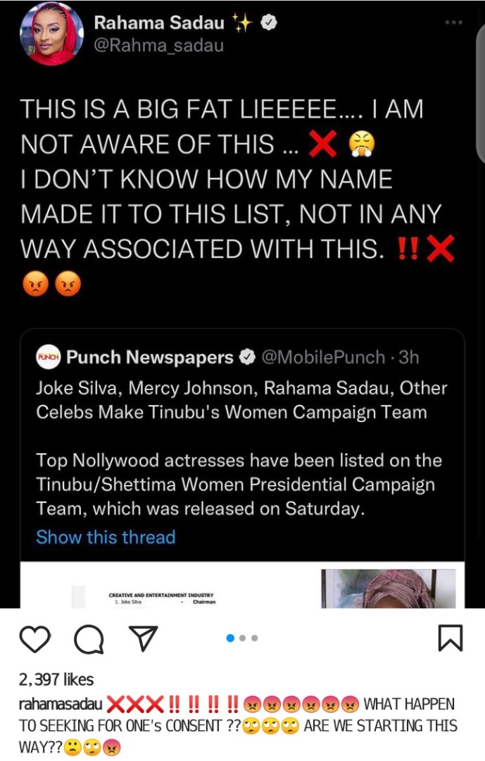 Kannywood actress, Rahama Sadau has disassociated herself from the Tinubu Women Campaign Team .