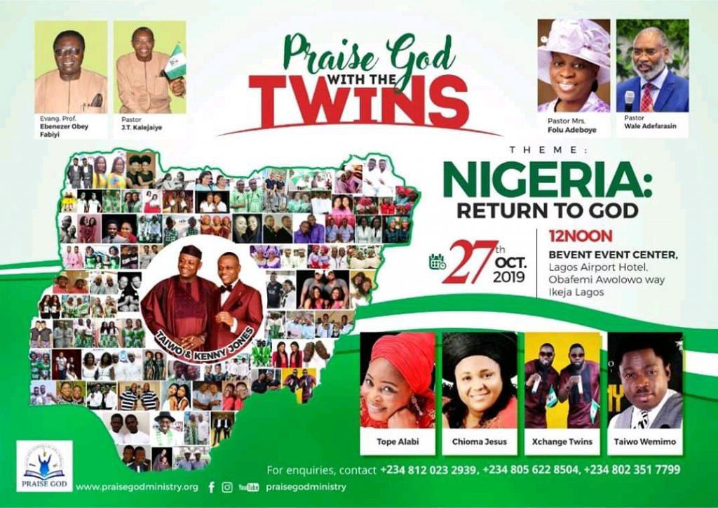Pastors Taiwo and Kenny Jones the convener of Praise God with the twins event disclosed that this year’s theme I Nigeria Return to God. “Nigeria is a rich nation with diverse interests that will allow us reach our full potentials but we need to continue seeking the face of God.” They said.
