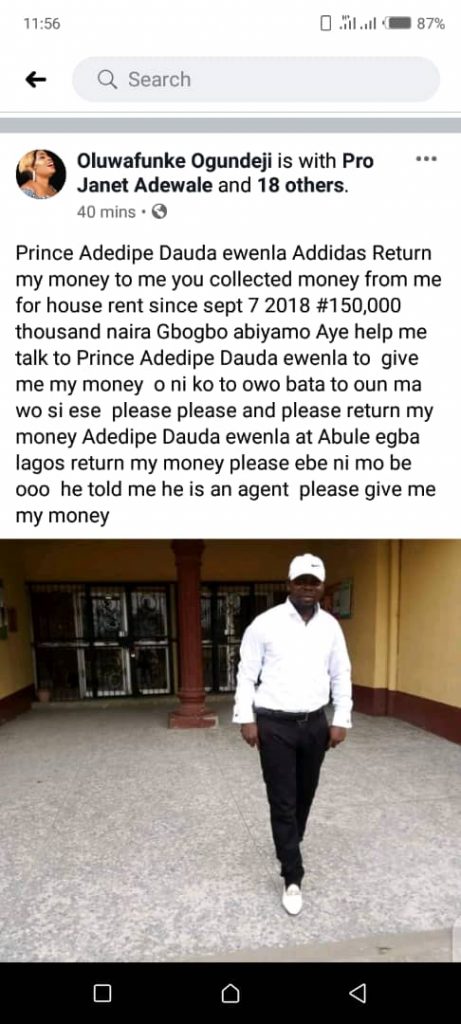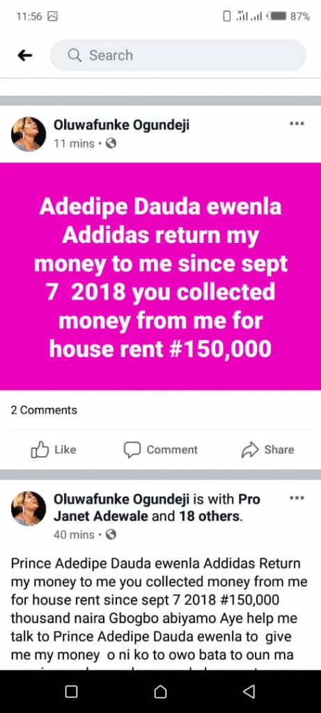 The woman in question through her social media page accused Adedas group CEO of duping her of N150,000 meant for house rent in 2018.