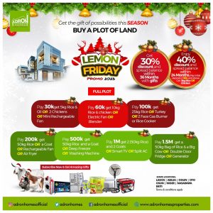 Leading Real Estate Firm, Adron Homes and Properties in its usual manner of building cities and creating affordable homes for low-income earners through its constant push to ensure everyone becomes a homeowner at a stress-free rate has now again launched its Lemon Friday End of the Year Promo ushering the yuletide season. The annual promo will enable prospective customers and already existing customers to enjoy unthinkable discounts on their landed properties and estates littered across the length and breadth of the country.