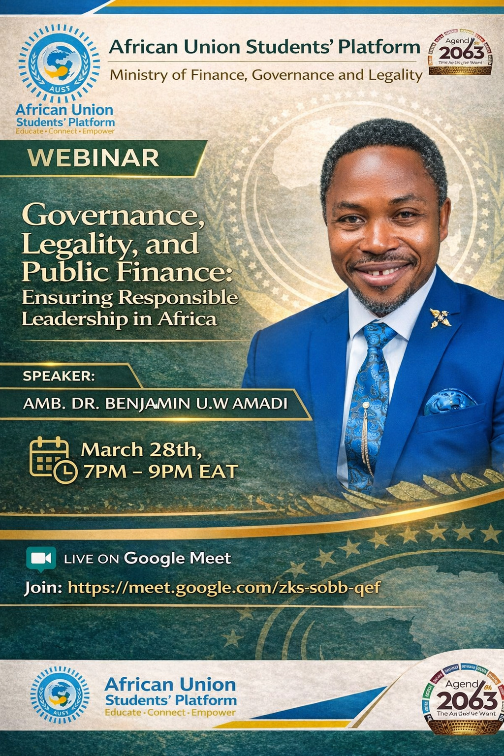 The African Union Students’ Platform, operating under the Ministry of Finance, Governance and Legality, is proud to announce an exclusive webinar titled _“Governance, Legality, and Public Finance: Ensuring Responsible Leadership in Africa.”_ The event is a flagship program of Agenda 2063, dedicated to educating, connecting, and empowering African youth to shape the continent’s future.