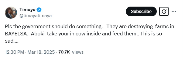 “Pls the government should do something. They are destroying farms in Bayelsa. Aboki, take your cow inside and feed them. This is so sad.”