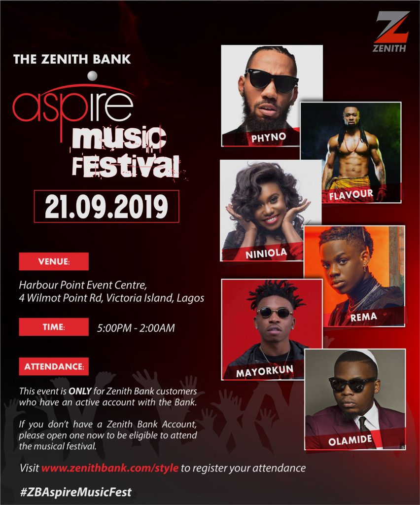 All is now set for the “Zenith Bank Aspire Music Festival” holding on Saturday, September 21, 2019 at the Harbour Point Event Centre, Victoria Island, Lagosby 5pm.