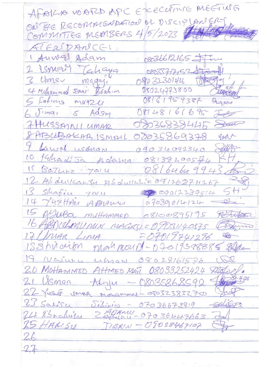 They committee therefore approved the following disciplinary action on them, which is as follows, deterred them from participating in all party activities of the party in Afaka ward and also suspended for being members of the party in Afaka.