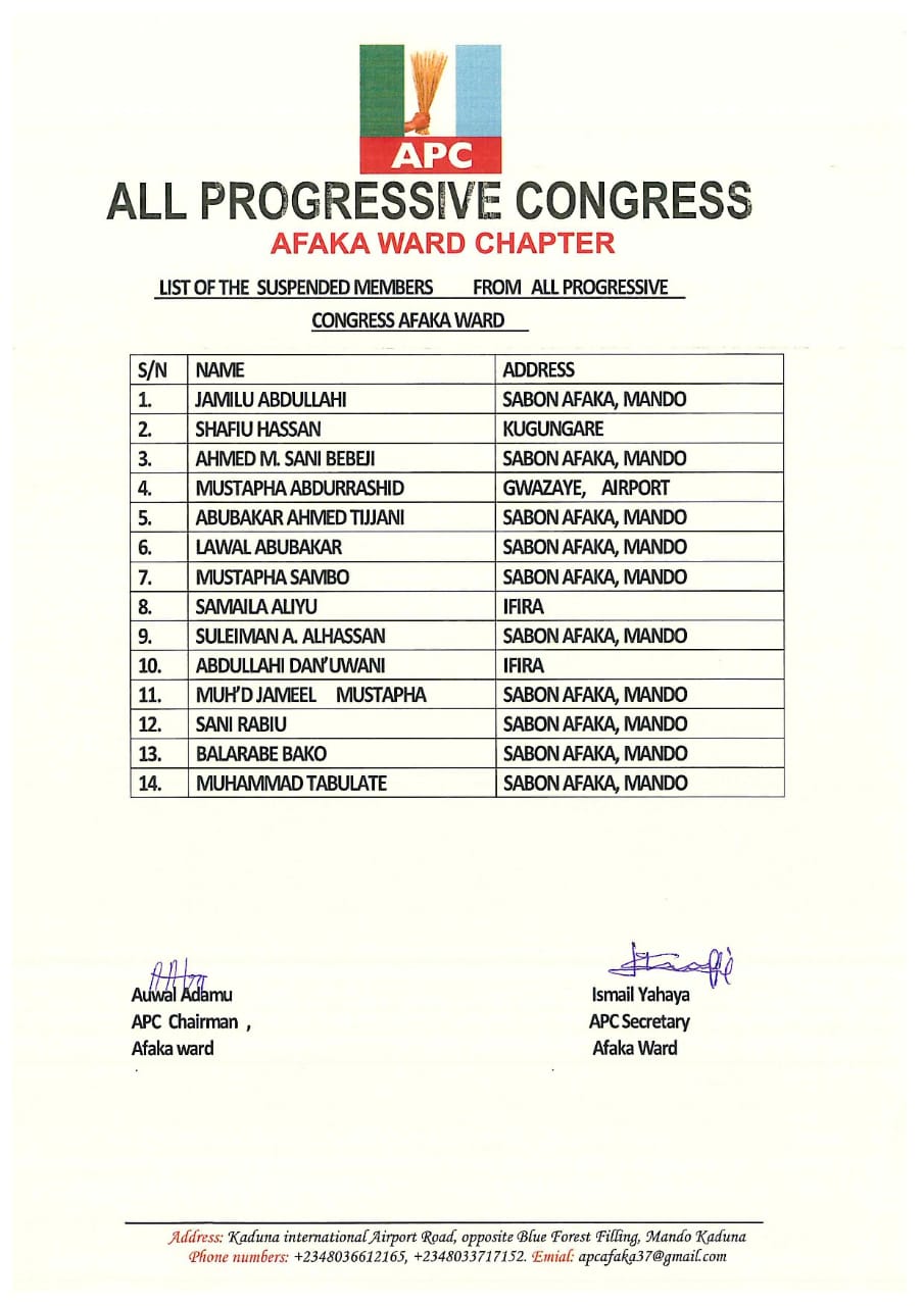 The Afaka branch of the All Progressive Party (APC) in Igabi local government of Kaduna state has after a weighty allegation on its members for offences bordering on anti-parties activities suspended 14 of members.