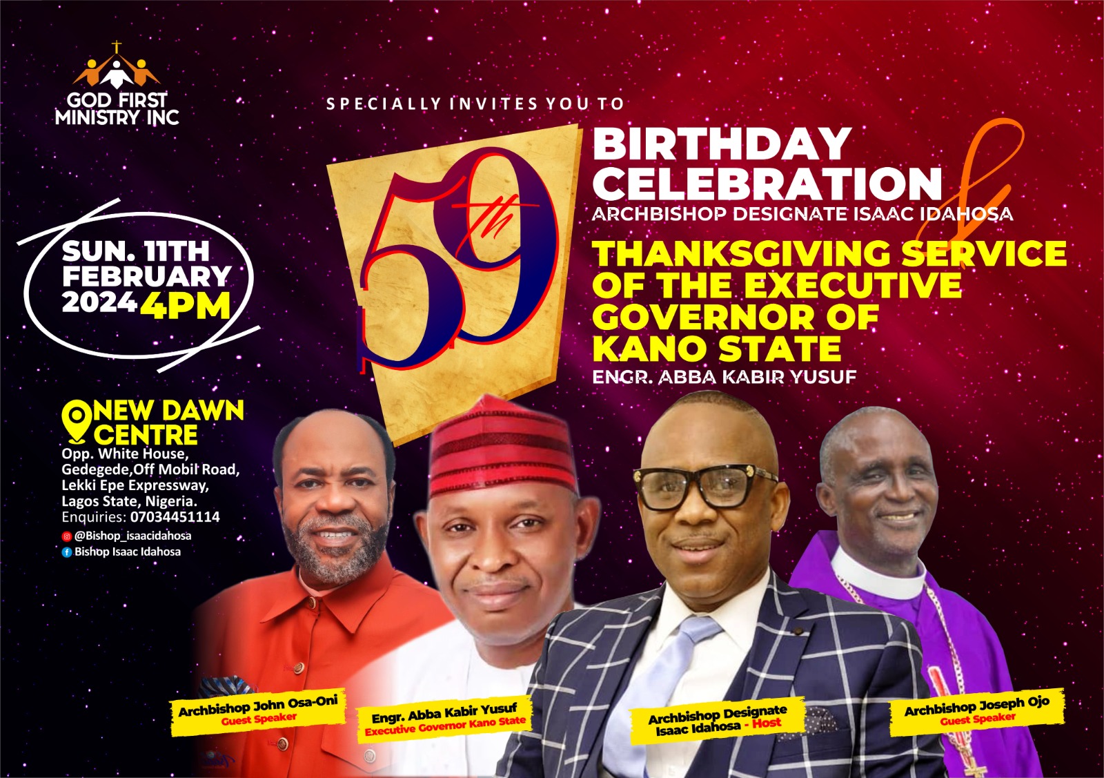The stage is set for an extraordinary event as Archbishop Isaac Idahosa Designate, the revered General Overseer of God First Ministry Inc., prepares to host the Annual Thanksgiving Service at the illustrious New Dawn Centre. This momentous occasion is dedicated to honoring the distinguished Executive Governor of Kano State, Engr. Abba Kabir Yusuf.