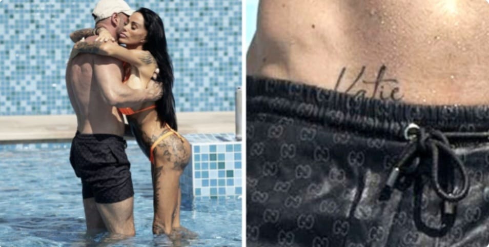 British media personality Katie Price is once again at the center of tabloid and public attention after being photographed poolside with her new husband, Lee, in a display of affection that quickly circulated across entertainment platforms. The images, reportedly taken during a recent leisure outing at a private resort location in the United Kingdom, show the couple embracing and kissing beside a swimming pool, with Lee prominently displaying a tattoo tribute dedicated to Price.
