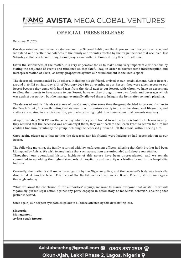 Currently, the matter is still under investigation by the Nigerian police, and the deceased’s body was tragically discovered at another beach Front about Six (6) kilometers from Avista Beach Resort, it will undergo a thorough autopsy.