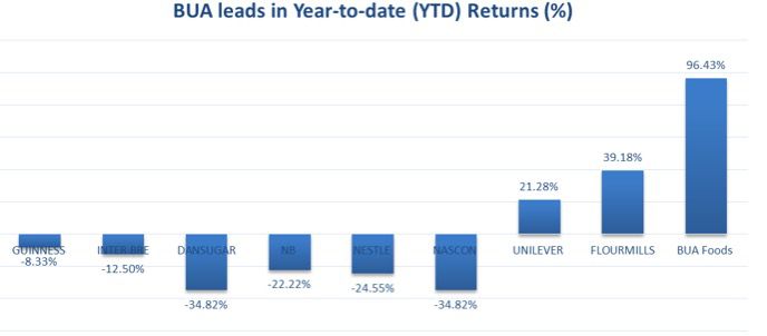 That compares with Unilever Nigeria’s year to date (YTD) returns of (+21.28 percent); Flour Mills Plc, (+39.18 percent); Nascon Allied Industries (-39.81 percent); Nestle Nigeria (-24.55 percent), Nigerian Breweries, (-22.22 percent); Dangote Sugar, (-34.82 percent); International Breweries, (-12.50 percent), and Guinness, (-8.33 percent).
