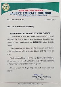 We thank the entire Jajere Emirate Council Tarmuwa Local Government Yobe State for doing the needful by this conferment as the Sadaukin Jajere.