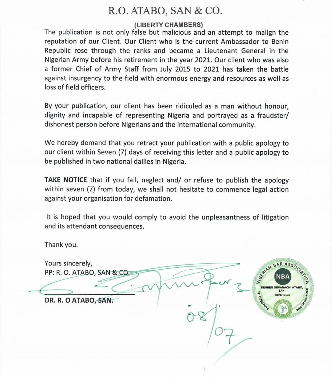 “Take notice that if you fail, neglect and/ or refuse to publish the apology within seven from today, we shall not hesitate to commence legal action against your organisation for defamation.