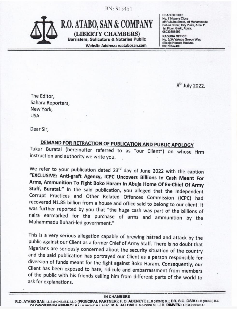 The notice, read: “We refer to your publication dated 23rd day of June 2022 with the caption: ‘EXCLUSIVE: Anti-graft Agency, ICPC Uncovers Billions In Cash Meant For Arms, Ammunition To Fight Boko Haram In Abuja Home Of Ex-Chief Of Army Staff, Buratal.’
