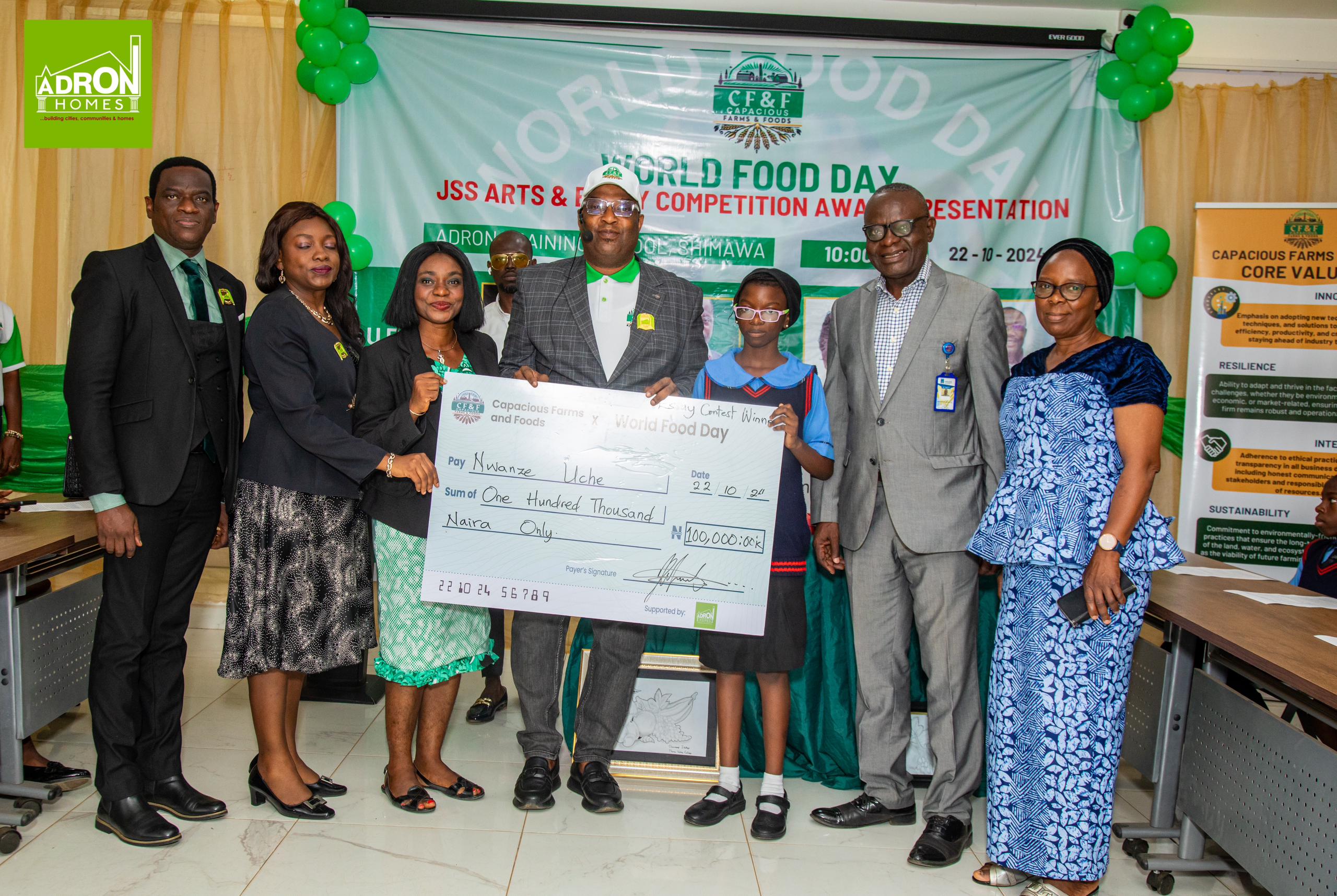 In celebration of World Food Day, Capacious Farms & Foods Ltd hosted the 2024 Junior Secondary School (JSS) Arts & Essay Contest Award Ceremony yesterday, with sponsorship from Adron Homes & Properties. The event, which took place at the Adron training School in Simawa, aimed to engage young minds in agriculture, creative arts, and essay writing to raise awareness about food security and sustainability.