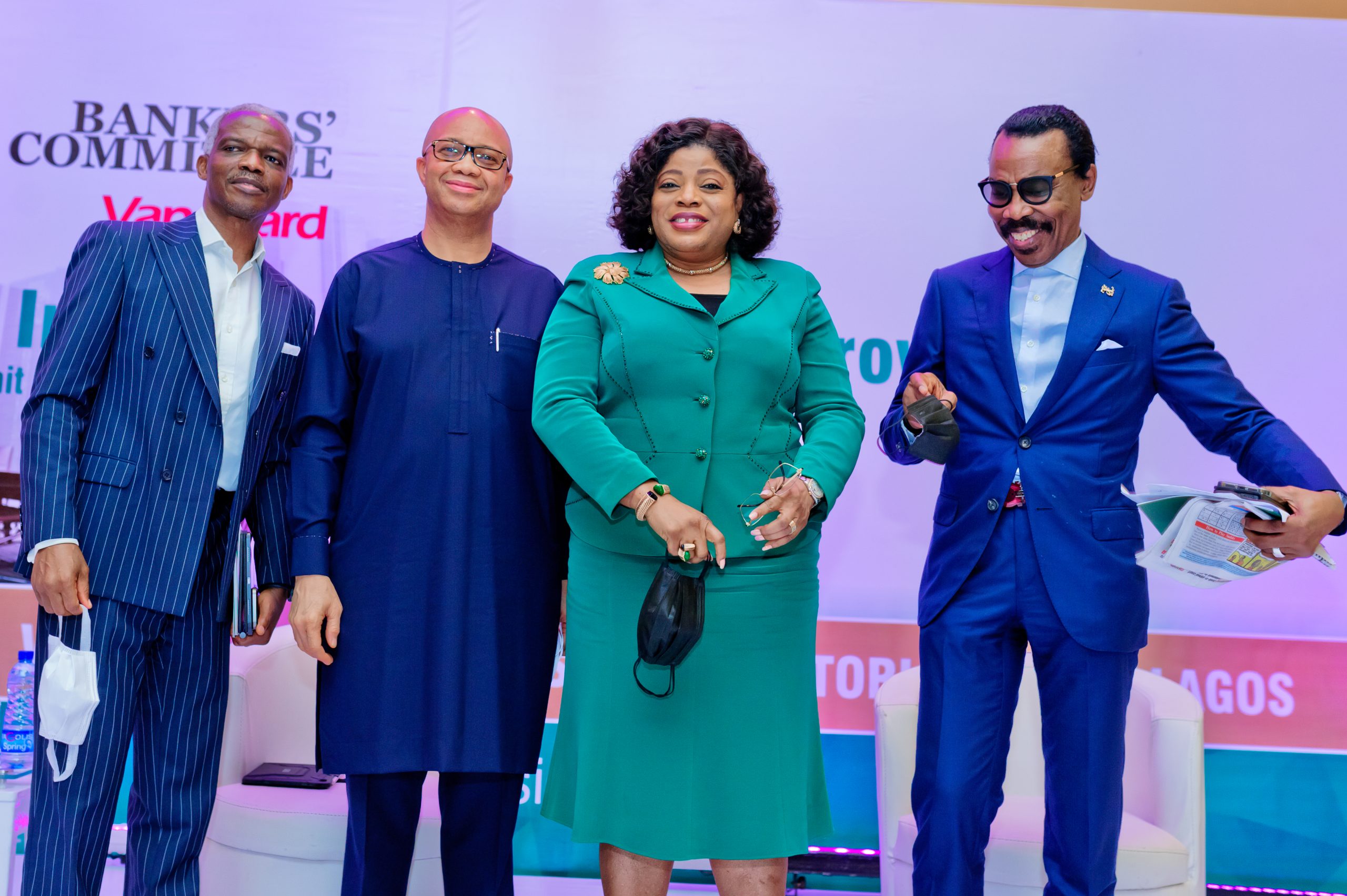 Caption: (left to right) Dr. Doyin Salami, Chairman Nigeria’s Economic Advisory Council, Mr. Ben Akabueze, Director General, Budget Office, Mrs. Nneka Onyeali-Ikpe, Managing Director/CEO Fidelity Bank and Mr. Bismarck Rewane, CEO, Financial Derivatives at the One-Day Summit on the Economy by bank CEOs, organized by the CBN/Bankers Committee and Vanguard Newspapers in Lagos Friday.