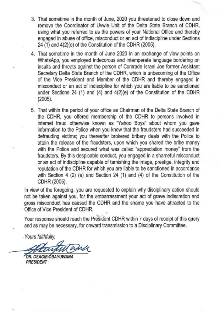 He was further accused of brokering bribery deals with the police to provide a front for the Yahoo Boys, an act which was said to be contrary to “Section 4 (2) and Section 24 (1) and (4) of the CDHR constitution (2005).”