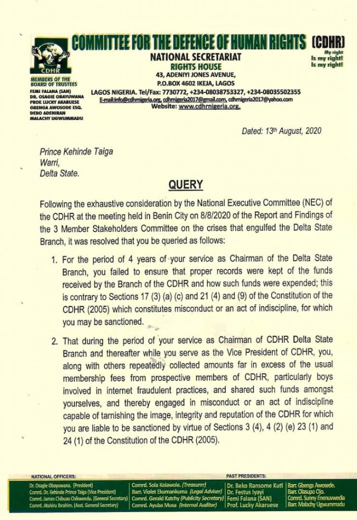 A letter signed by the President of CDHR, Dr Osagie Obayuwana stated that the group reached the resolution at a National Executive Committee (NEC), meeting held on August 8, 2020 in Benin City, where it was decided that Taiga be suspended for one year, following series of allegations, ranging from anti-association activities to aiding and abetting with fraudsters.