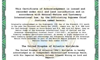 SOVEREIGN INTERNATIONAL COURT OF JUSTICE ISSUES CERTIFICATE OF ACKNOWLEDGEMENT TO THE UNITED KINGDOM OF ATLANTIS WORLDWIDE
