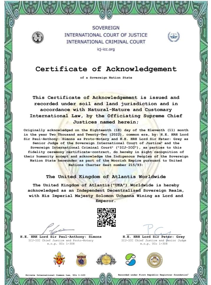 The Sovereign International Court of Justice – International Criminal Court (ICJ-ICC) has issued a *Certificate of Acknowledgement* recognizing the *United Kingdom of Atlantis (UKA)* Worldwide as an *Independent Decentralized Sovereign Nation*. This landmark acknowledgement affirms the UKA’s sovereignty and its status within the global community of nations.