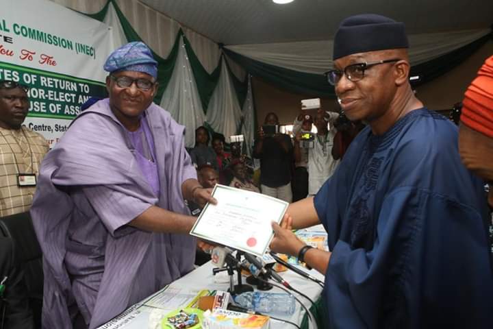 “Receiving my Certificate of Return today at INEC Headquarters in Abeokuta, Ogun State.