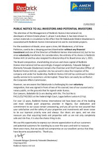 The attention of the Management of Redbrick Homes International Ltd, developers of Amen Estate phase 1, phase 2 and phase 3, has been drawn to certain materials in circulation to the effect that Mr Babatunde Olalere Gbadamosi is associated with Redbrick Homes International Ltd and its real estate projects.