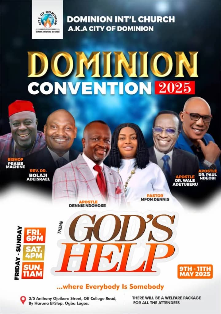 Dominion International Church, a.ka. City of Dominion, is pleased to announce the commencement of preparations for its Annual Convention— *Dominion Convention 2025*. This highly anticipated event will take place from Friday, May 9 to Sunday, May 11, 2025, at the church’s headquarters, located at 3/5 Anthony Ojeikere Street, College Road by Haruna Bus Stop, Ogba, Ikeja, Lagos.
