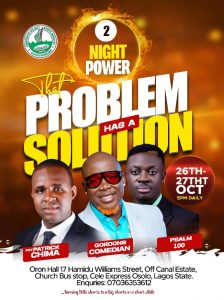 It’s a 2 Night Of Power and Solutions to different kinds of problems. To commence at Oron Hall, 17, Hamidu Williams street, Carnal Estate Church bus stop, Cele Express, Osolo Lagos State.