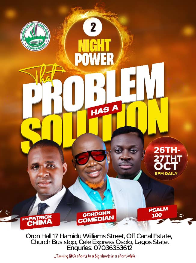It’s a 2 Night Of Power and Solutions to different kinds of problems. To commence at Oron Hall, 17, Hamidu Williams street, Carnal Estate Church bus stop, Cele Express, Osolo Lagos State.