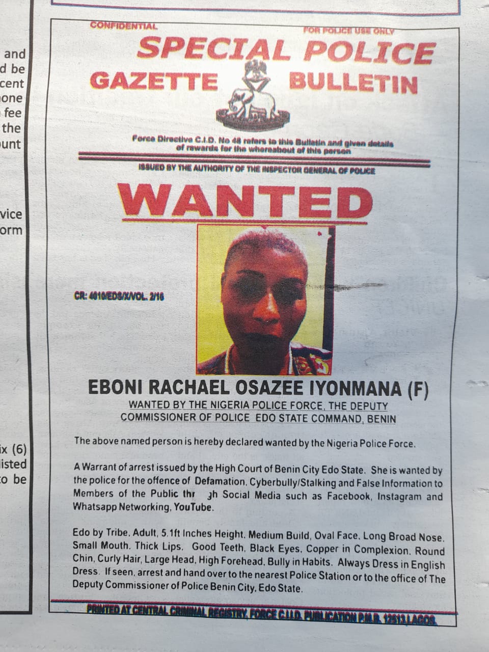 After extensive investigation by the various police departments and the continuous cyberStalking and blackmailing of Festus Alenkhe by the said Eboni Godswill, the police then declared her wanted.