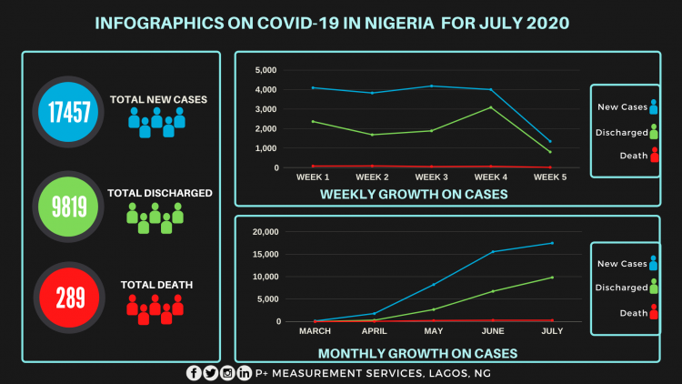From the analysis, there were 17,457 new cases, 9,819 discharged and 879 deaths recorded in the month of July with the fourth week recording 4,003 new cases, 3,087 discharged and 63 deaths. In June, it was recorded that there were 15,532 new cases, 6,739 discharged and 25 deaths.