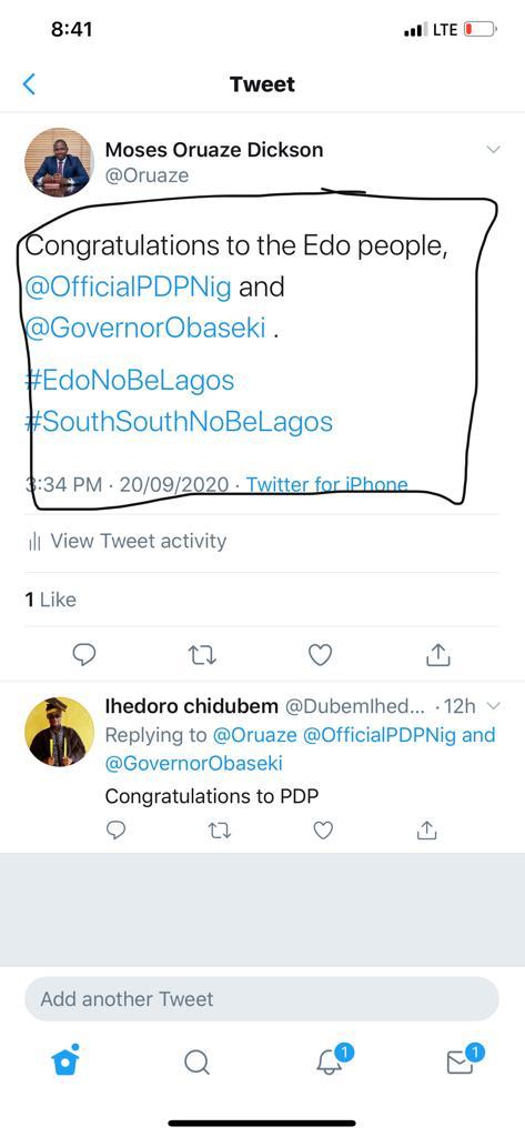 Barrister Moses Oruaze Dickson has added to the numerous voices championing the “#EdoNoBeLagos, SouthSouthNoBeLagos” movement calling on Edo people not to allow personalization of lagos by external forces. In his tweet earlier this morning he narrates the sad experiences his state went through during the 2019 Governorship election that led not only to oppression of the people, violence and high tech electoral fraud but loss of lives of his fellow brothers, sisters and kinsmen by agents of APC led by Adams Oshomole.