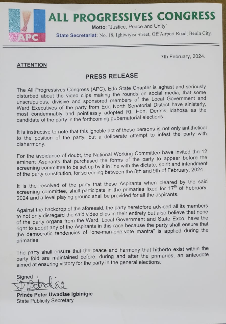Party leaders, doesn’t want the same scenario to happen again, reason for wanting the best candidate with no criminal allegations, popularity among the electorates, a tested and trusted politician, that will make Edo great again. APC has also released a statement to debunk the alleged endorsement of Dennis Idahosa