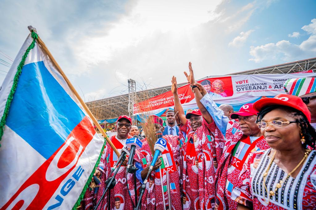 The APC National Chairman, Senator Abdullahi Adamu, who led other members of the National Working Committee (NWC) to the rally, presented the governorship flag to Oyebanji who was joined by his running mate, Chief (Mrs.) Monisade Afuye and the wife of the candidate, Dr. Olayemi Oyebanji.
