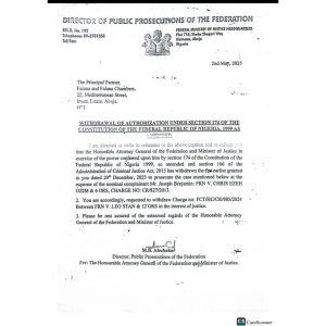 The letter titled: Withdrawal of Authorization Under Section 174 of the Constitution of the Federal Republic of Nigeria, 1999 as Amended, reads: “I am directed to write in reference to the above caption and to inform you that the Honourable Attorney General of the Federation and Minister of Justice in exercise of the power conferred upon him by section 174 of the Constitution of the Federal Republic of Nigeria, 1999, as amended and section 106 of the Administration of Criminal Justice Act, 2015, has withdrawn the fiat earlier granted to you dated 20th December 2023 to prosecute the case mentioned below at the expense of the nominal complainant Mr. Joseph Benjamin: FRG V. Chris Eze Ozims and 6 others, Charge No: CR/827/2013.