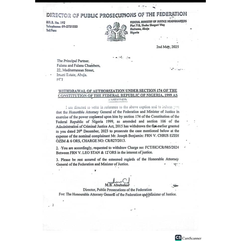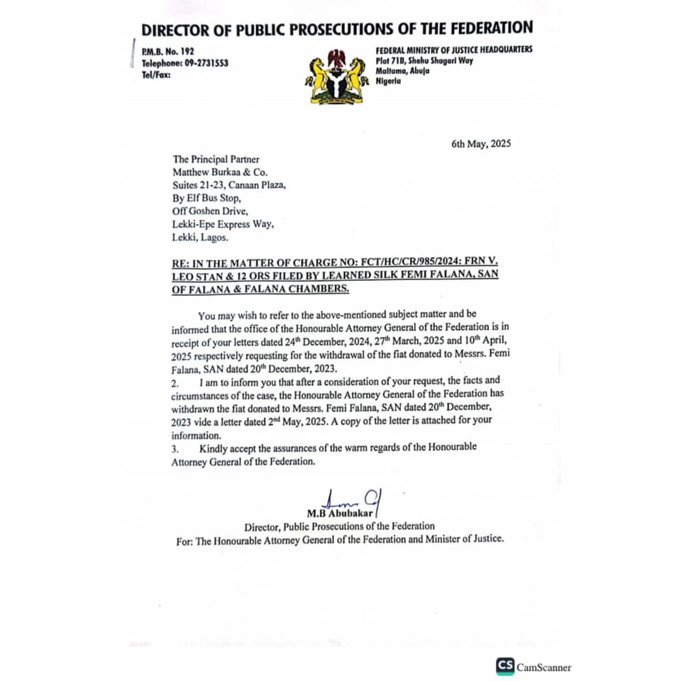 In the latest development, the current AGF, Mr. Lateef Fagbemi SAN, in a letter dated 2nd May 2025, addressed to The Principal Partner, Falana and Falana Chambers, and signed by Mr. M.B Abubakar, Director, Public Prosecutions of the Federation, directed Falana to withdraw Charge No: FCT/HC/CR/985/2024 (FRN. v. Leo Stan and 12 others), in the interest of justice; signifying that the fiat ought not to have been donated to him in the first place.