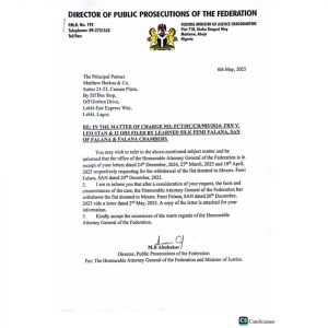 The Director, Public Prosecutions of the Federation, conveyed the message of the withdrawal to the chamber of Matthew Burkka & Co., chief counsel to the defendants via a letter dated 6th May, 2025. The letter read inter alia: “You may wish to refer to the above-mentioned subject matter and be informed that the office of the Honourable Attorney General of the Federation is in receipt of your letters dated 24th December, 2024; 27th March 2025 and 10th April 2025 respectively, requesting for the withdrawal of the fiat donated to Messrs. Femi Falana SAN dated 20th December 2023.