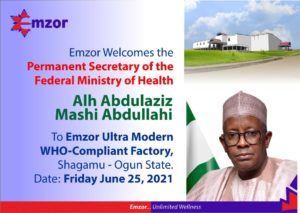 Today, Friday, 25th of June 2021, the Permanent Secretary of the Federal Ministry of Health, Alh. Abdulaziz Mashi Abdullahi, will be paying an official courtesy visit to the new manufacturing complex at Sagamu. The Permanent Secretary will tour the facilities and grounds of the manufacturing complex.