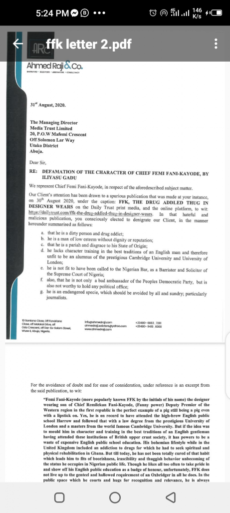 In his pre-litigation letter, however, Fani-Kayode described the article as libelous and demanded an apology from the newspaper, which must be published in other national dailies.