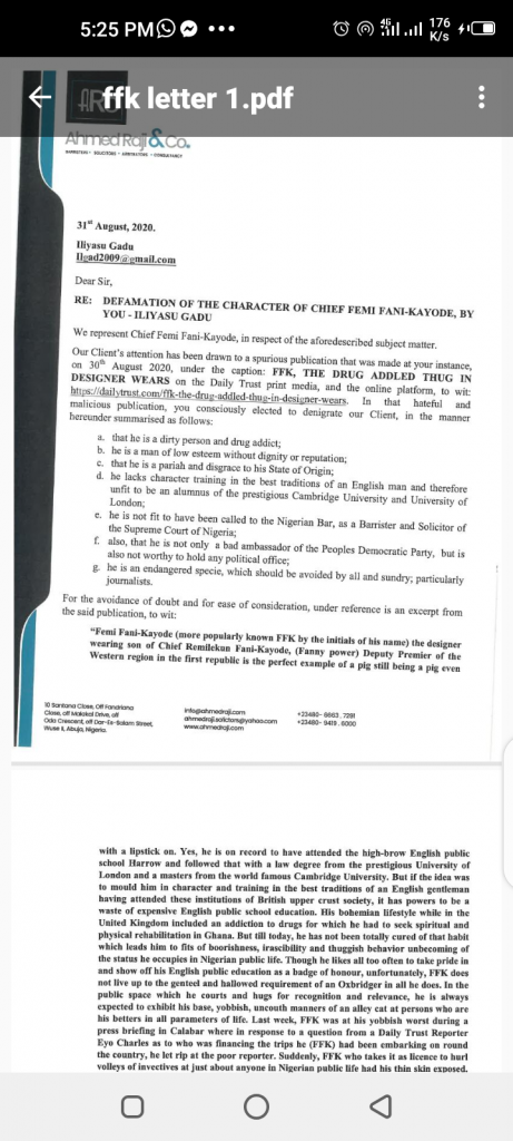 Fani-Kayode said this in a letter addressed to the Managing Director of Daily Trust, dated August 31, 2020, and titled, ‘Defamation of the character of Chief Femi Fani-Kayode by Iliyasu Gadu.’
