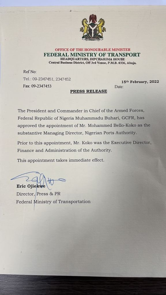 In a statement issued today, the Federal Ministry of Transport confirmed the appointment of Bello-Koko as the substantive head of the Authority by President Buhari.