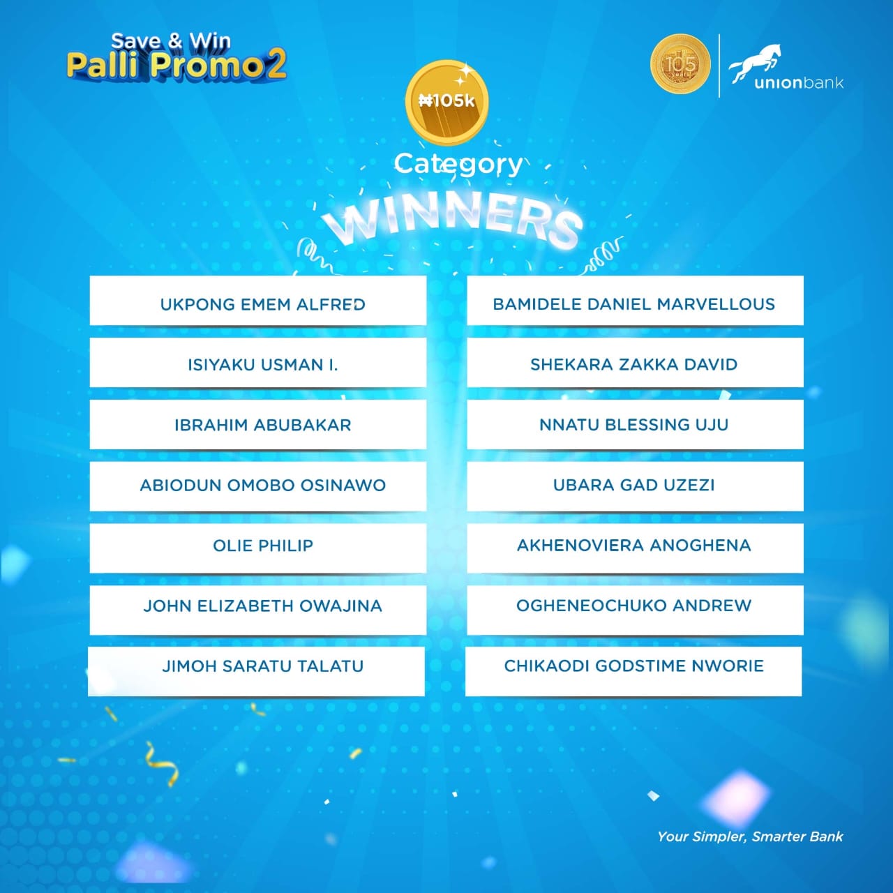 Leading financial institution Union Bank of Nigeria has rewarded the first set of winners in the second edition of its Save & Win Palli promo.
