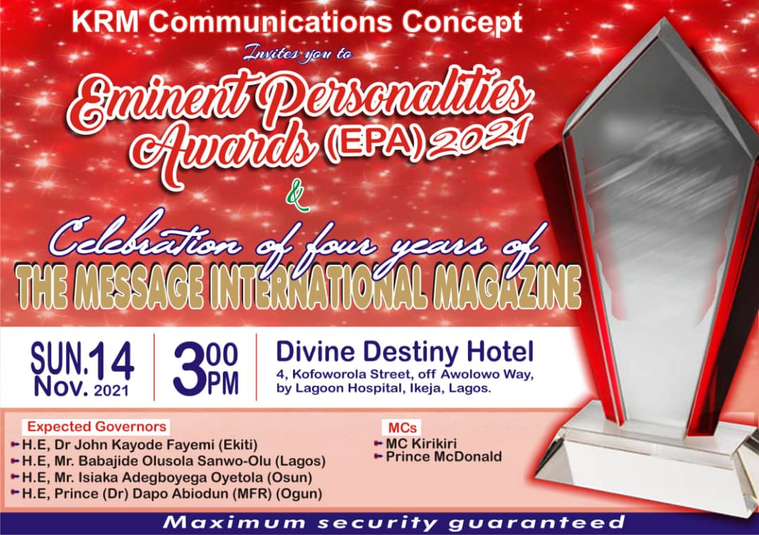 Surely, all roads will lead to Dive Destiny Hotel, 4, Kofoworola street, off Awolowo Way, Ikeja, Lagos by Lagoon Hospital on Sunday, November 14, 2021 as KRM Communications Concept, publisher of The Message International magazine and online platform stages third edition of Eminent Personalities Awards (EPA).