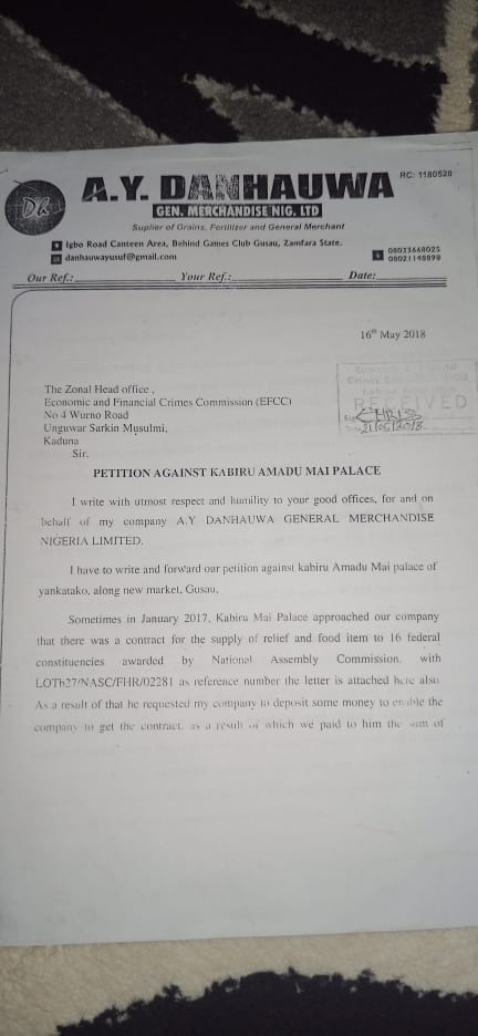 Sometime in May 2018, Hon. Kabiru Amadu Mai ‘Palace’ collected Millions of Naira as bribe from A.Y DAN HAUWA GENERAL MARCHANDISE NIGERIA LIMITED with the promise to pave a way for the company to supply grains to 16 Federal constituencies across the Nation.
