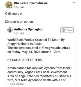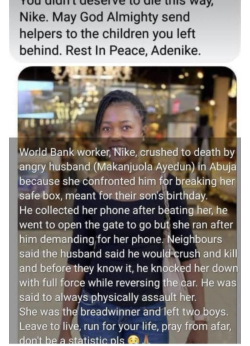 Nigerians are mourning a woman who was allegedly crushed to death by her angry husband as she tried to stop him from driving out of the compound with her phone.     According to SaharaReporters, the husband named Makanjuola Ayedun from Isanlu community, Yagba East Local Government Area of Kogi State, crushed his wife, Mrs Nike Ayedun to death with his car.     The incident occurred at Gwagwalada, Abuja, on Friday, May 14, 2021 around 10pm.     Ayedun allegedly knocked down his wife, Nike, a staff member of World Bank office at Asokoro, Abuja, while reversing his car.      It was learnt that due to the speed with which he reversed, the car crossed an untarred road and crashed into a building where some things were destroyed.       Ayedun allegedly tried to flee when he realised that he had killed his wife, blaming the incident on brakes failure.     However, SaharaReporters said a source revealed that it was not an accident. A source also alleged that the man had always physically assaulted his wife.     The source said, according to the publication: "The whole issue started when Nike discovered that the safe box she had got for the purpose of saving money for her son, who demanded a huge birthday party, had been broken by her husband. She then confronted him about it. That was how the husband started beating her.     "After beating the hell out of her in the house, he collected her phone so that she could not call anyone. The man went outside and turned on his car's engine while he came down to open gate. Nike ran to the gate demanding her phone. The husband said he would crush and kill her, and before she knew what was happening, the man knocked her down with full force while reversing the car," the source said.    Nike, a mother of two boys, was said to be the breadwinner of the family as her husband was not employed.      Friends have gone on Facebook and Twitter to mourn the mum-of-two.
