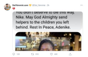 Nike, a mother of two boys, was said to be the breadwinner of the family as her husband was not employed.