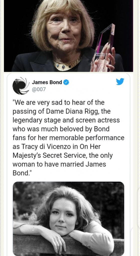 Life they say is a stage and we are all actors who will play his or her own part and leave exit the stage . Sadly, veteran Actress Dame Diana Rigg, famous for roles including Emma Peel in TV series The Avengers and Olenna Tyrell in Game of Thrones, has died at the age of 82.